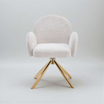 La chaise Nola se distingue par son design élégant et son confort optimal. Revêtue d’un tissu de couleur taupe et soutenue par des pieds en métal doré, elle allie raffinement et solidité. Son assise moelleuse et sa fonction pivotante à 360° degrés en font un choix parfait pour accompagner votre table de repas ou votre espace bureau.