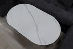 – Version effet marbré blanc gris/pieds blancs : plateau en céramique effet marbré blanc gris avec un support en bois MDF sous la céramique, garantissant solidité, durabilité et des pieds en bois MDF coloris laqué blanc.